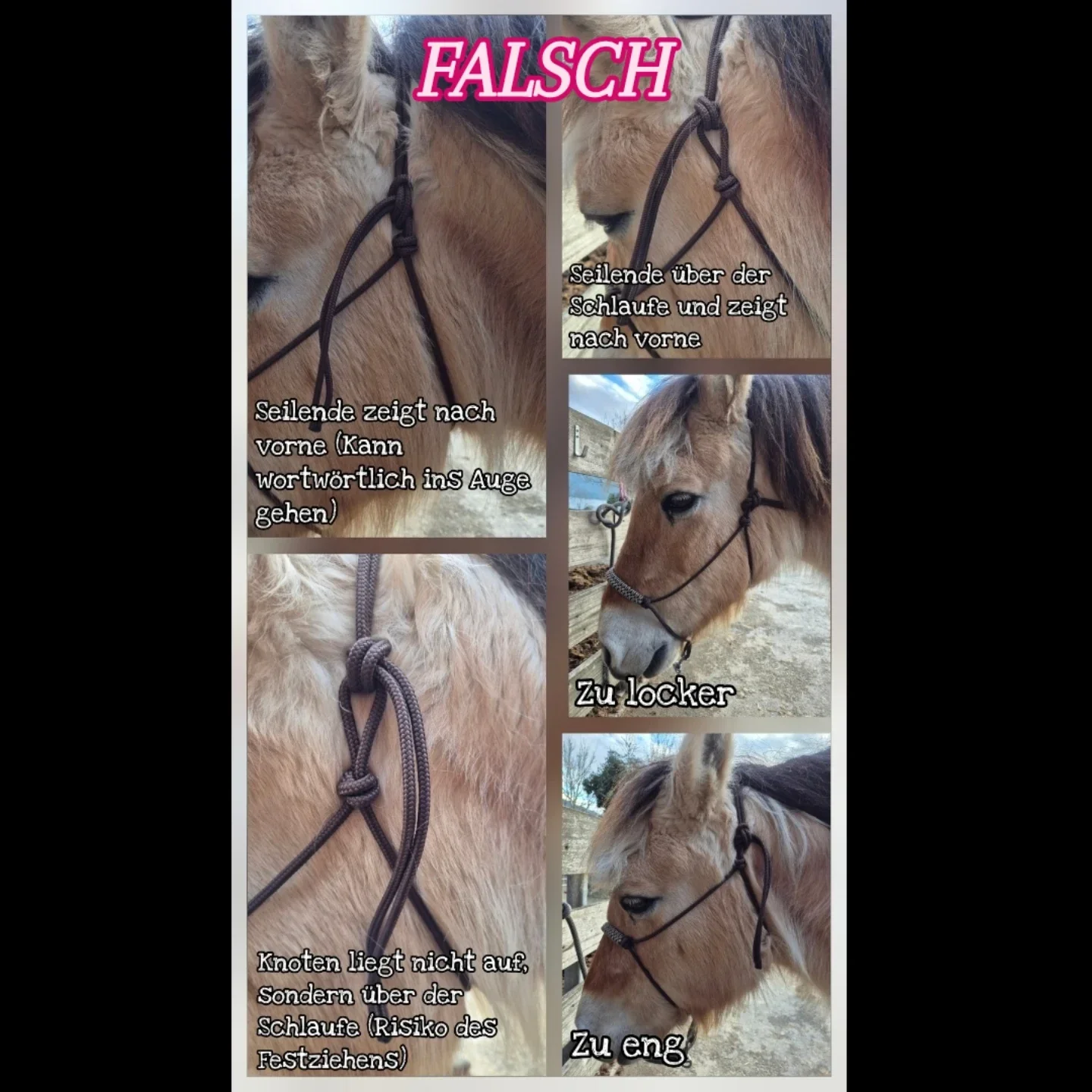 Nur ein richtig angepasstes und korrekt verschlossenes Knotenhalfter ist dem Pferd bequem. Unsachgemäss kann es dem Pferd Unbehagen oder Schmerz bereiten und es kann Verletzungen verursachen.
